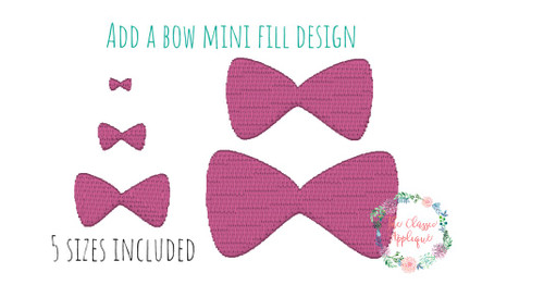 This file includes a 5 separate mini fill stitch bow designs to be added used by themselves or added to the design of y our choice! These bows come in 5 different sizes: