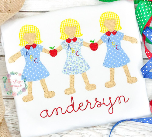 This file includes a blanket stitch finish paperdoll girls applique holding fill stitch apples and "ABC" dress detail. This design comes in a 5x7 (6.43 x 3.75 inch) and 6x10 (9.56 x 5.62 inch) hoop size.