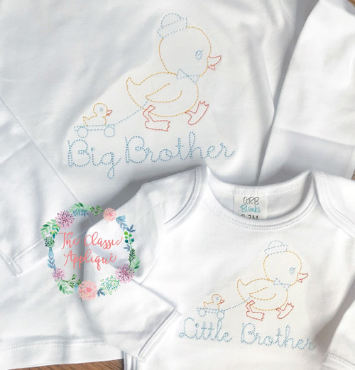 This listing includes a vintage stitch little boy duck and pull toy embroidery design and comes in a 4x4 and 5x7 hoop size. There is a matching girl duck in a separate listing as well!