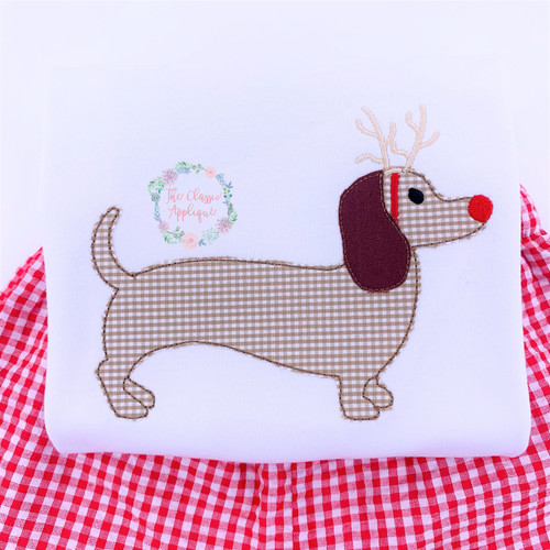 This file includes a bean stitch applique reindeer dachshund machine embroidery design. This design comes in three different sizes: