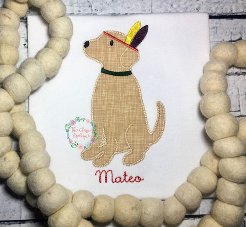 This file includes a Thanksgiving zig zag applique lab dog with feather headband embroidery design. This design comes in three different sizes: