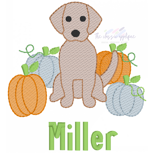 This file includes a dog with pumpkins sketch fill machine embroidery design. This design comes in four different sizes: