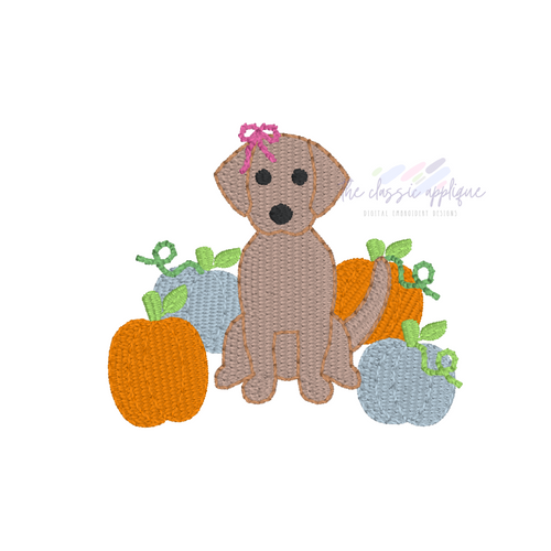 This file includes a single mini fill stitch dog with pumpkins machine embroidery design. This mini design comes in three different sizes: