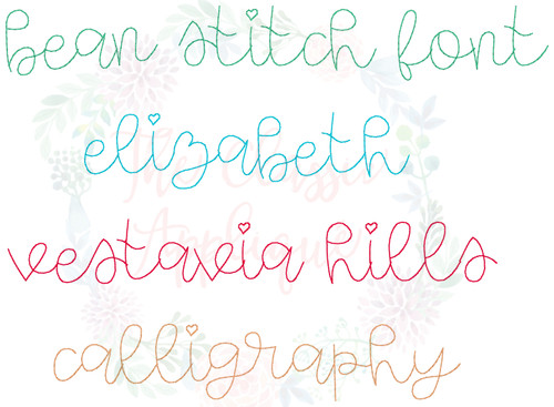 This file includes a bean stitch machine embroidery design font. This fun vintage stitch, all lowercase, calligraphy handwritten font comes in 4 different sizes: