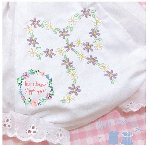 This file includes a beautiful heirloom inspired floral bow embroidery design. It has a finished stitched size of 3.5 by 3.8 inches. I do not recommend resizing.
