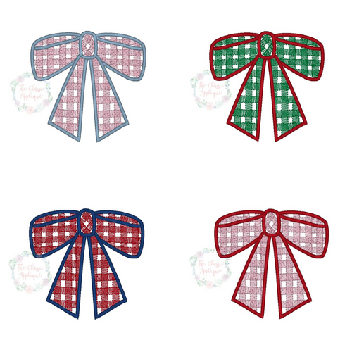 This file includes a single gingham sketch fill bow with satin stitch outline machine embroidery design. This design comes in four different sizes: