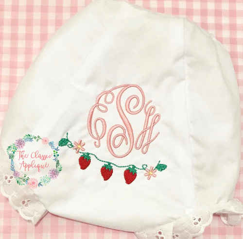 This file includes a vintage stitch vine with fill stitch strawberries and flowers embroidery design that can be used as a monogram frame or by itself. This file comes in a 4 inch, 5 inch, and 6 inch in length sizes.
