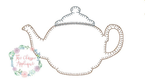This file includes a blanket stitch finish teapot applique design. This file comes in a 4x4, 5x7, and 6x10 hoop size. I do not recommend resizing designs.